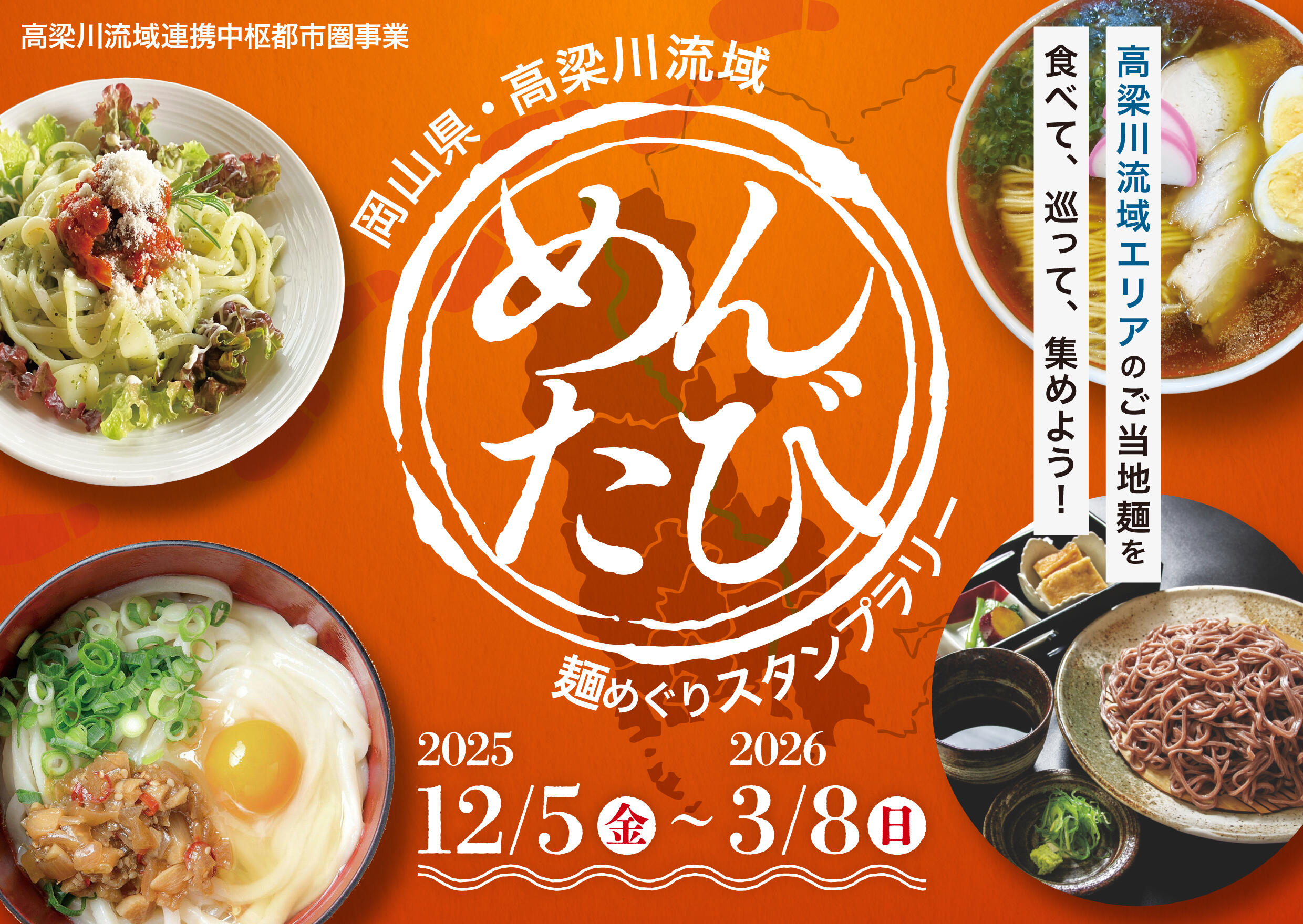 2025年12月5日(金)より、高梁川流域エリアの10市町(倉敷市・新見市・高梁市・総社市・早島町・矢掛町・井原市・浅口市・里庄町・笠岡市)の「麺料理」を巡るスタンプラリー「めんたび」を開催中です!